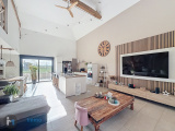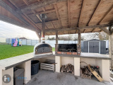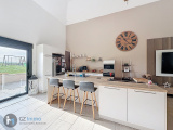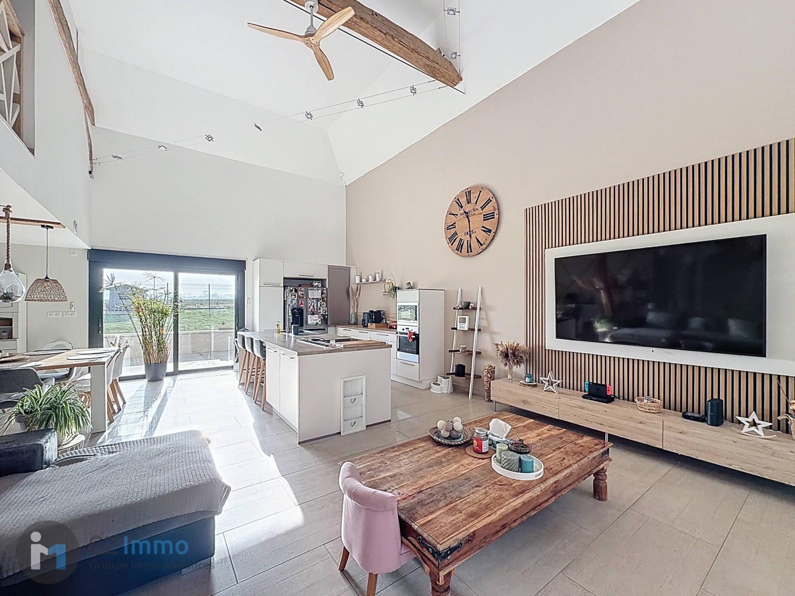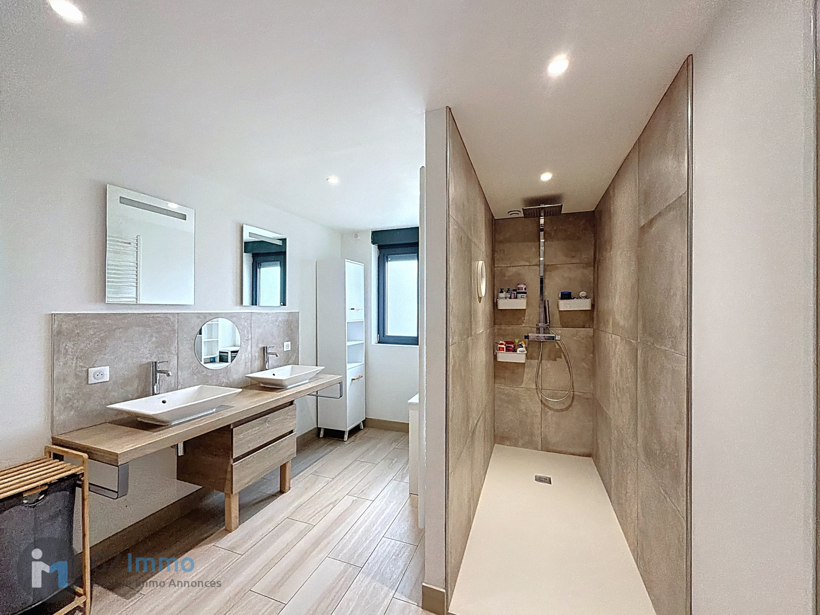 Cette maison comprend au rez-de-chaussée : Une entrée avec placards, une pièce de vie lumineuse de 70 m² avec belle hauteur sous plafond donnant sur une terrasse de 65 m² avec apprenti, cuisine d'été, barbecue et four à pizza, une cuisine ouverte équipée et aménagée avec îlot central, deux chambres dont une avec dressing, une salle de bains, un WC, un bureau, une buanderie, un garage attenant de 40 m².